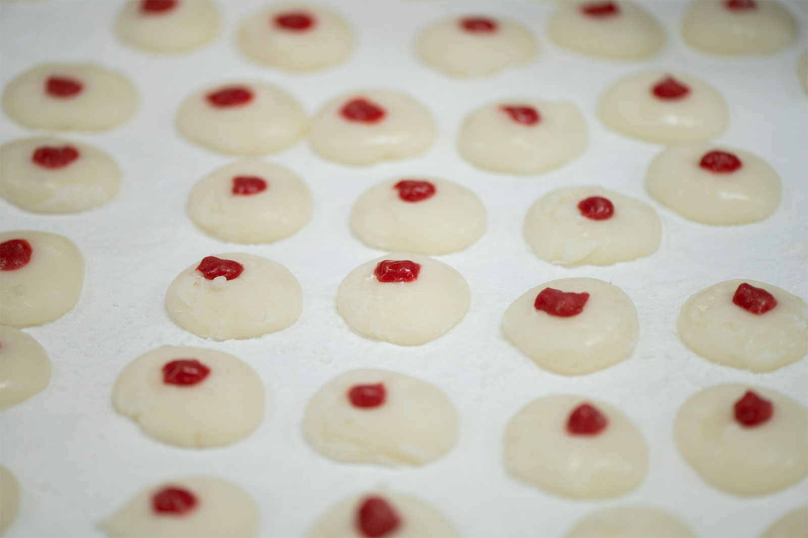 さて鈴懸の葩餅はというと、求肥仕立ての外側も全て丸ごとお食べください。明治時代以降、裏千家のお家元が宮中より初釜で使うことを許されたことにより、今では茶道の初釜や、新春のお茶会の主菓子としてもよく用いられています。時々鈴懸の店頭でもお客様に、この半円の形をした葩餅は半円の曲線を描いている方を手前に置くのか、はたまた逆かということをお尋ねされます。従来のお茶席で出されるお菓子で二つ折れのものは、輪が向こうで開いた口の方を手前にお客様にお出しするとされますが、葩餅の場合は懐紙の上に取り、菓子切りで一口大に切り分けたときに、中の白味噌餡がこぼれやすく着物を汚してしまわないようにとの配慮から、今では開いた口を向こうにするとされているようです。お茶席ではお流派やご亭主の意向に合わせていただくのが良いでしょう。ご家庭ではお菓子の向きを気にすることなく、宮中の儀式に想いを馳せながらも豪快に丸かぶりするのもまた良しです。古くより続くお正月ならではの縁起菓子をご自分なりに美味しくいただきながら、今年一年の計画を立ててみませんか。