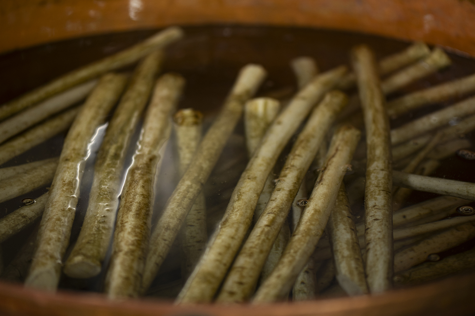 葩餅の、姿にも味にも大きな一役を担うのが、お菓子の材料としては珍しい牛蒡。野趣溢れる牛蒡が挟まれた餅がなぜ縁起菓子なのかと不思議に思われる方もいらっしゃるかもしれません。牛蒡は、地に深く根を張ることで安泰をを願い、おせち料理にも用いられます。葩餅では、この牛蒡を一年で成長する鮎の習性から “立身出世”の縁起物とされる押し鮎として見立てて甘煮します。その牛蒡を京雑煮に見立てた白味噌餡で包み巻きます。小豆汁で染めた菱形の餅を平たく押し広げた白い餅に重ねて、真ん中に牛蒡と白味噌餡を挟んで二つ折りにしたお菓子が葩餅です。この梅の花びらの姿を模したお菓子は、平安時代の宮中ではお正月の元旦から三日にかけて行われていた“歯固めの儀式”で用いられていたことに由来し、今でも正月の縁起菓子として親しまれています。